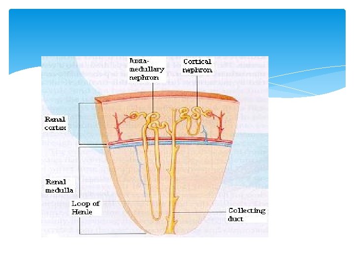 TYPES OF NEPHRON Cortical nephron: present in renal cortex, short loop of henle, that is surrounded by tortuous peritubular cappillaries. Juxtra medullary nephron(30%): present near corticomedullary junction, long loop of henle, surrounded by straight pt cappillaries, k/as vasa recta, concerned with concentration of urine.