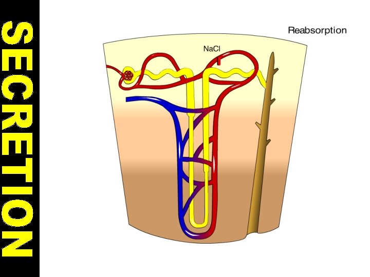 REABSORBTION • The absorbtion of needed materials such as glucose, amino acids and water from nephrons to blood capillaries is called reabsorbtion. • Water is reabsorbed passively by osmosis. But reabsorbtion of glucose, aminoacids and salt ions occurs by active transport.