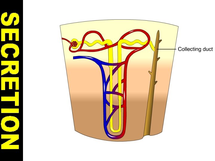 SECRETION • The cells of distal tubule excrete molecules such as penicilin, ammonia, potassium and excess acids. This process is called secretion. • After secretion, the fluid remaining in the nephrons is called urine. • Urine contains urea, uric acid, sodium, potassium, calcium, chlorine, phosphorus, water and small amount of cells.