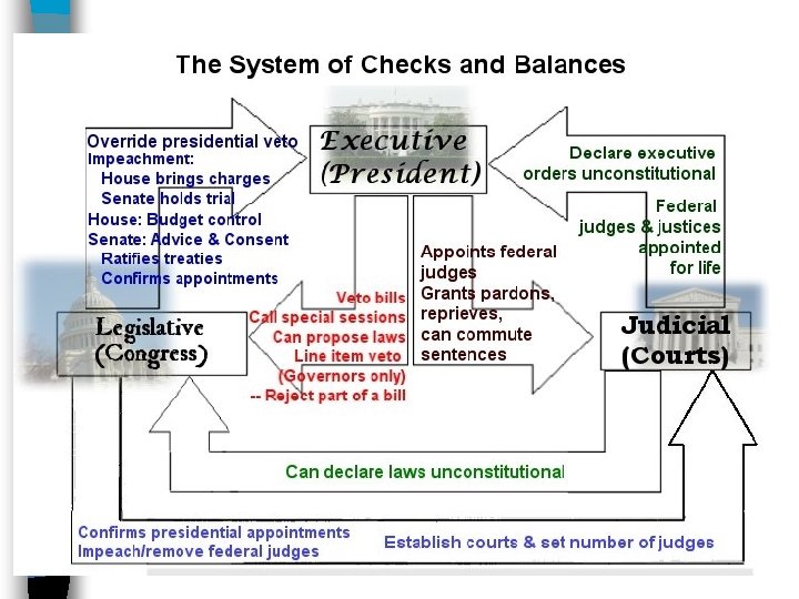 Emergency Powers n Truman and the Steel Mills: – Executive order to take over the mills during the Korean War – Rejected by the Supreme Court n It seems that if the action by the president is popular, Congress isn’t too bothered by it, but if the presidential action isn’t popular, Congress or the Supreme Court can step in through the checks and balances system as it did with Truman.