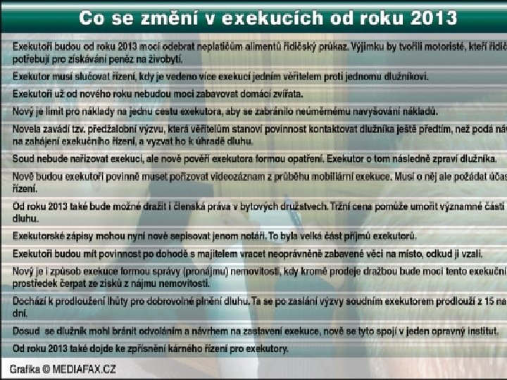Od 1. 1. 2013 řada novinek Více viz článek z 1. 1. 2013 9: 48 „Co nás čeká“ na tn. cz http: //tn. nova. cz/zpravy/na-vasi-strane/zmeny-v- roce-2013 -exekutori-nove-nebudou-potrebovatnarizeni-soudu. html