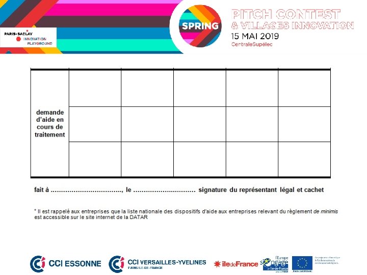 DECLARATION SUR L’HONNEUR aides de minimis perçues Je soussigné, …………………………. . (nom/prénom), représentant légal en tant que …………………………………. . … de la société/association ………………………… atteste sur l’honneur que la liste ci-dessous comporte l’ensemble des aides publiques perçues ou demandées : Ø en application du Règlement (CE) n° 1998/2006 du 15 décembre relatif aux aides de minimis , au cours deux derniers exercices fiscaux et de l’exercice fiscal en cours :