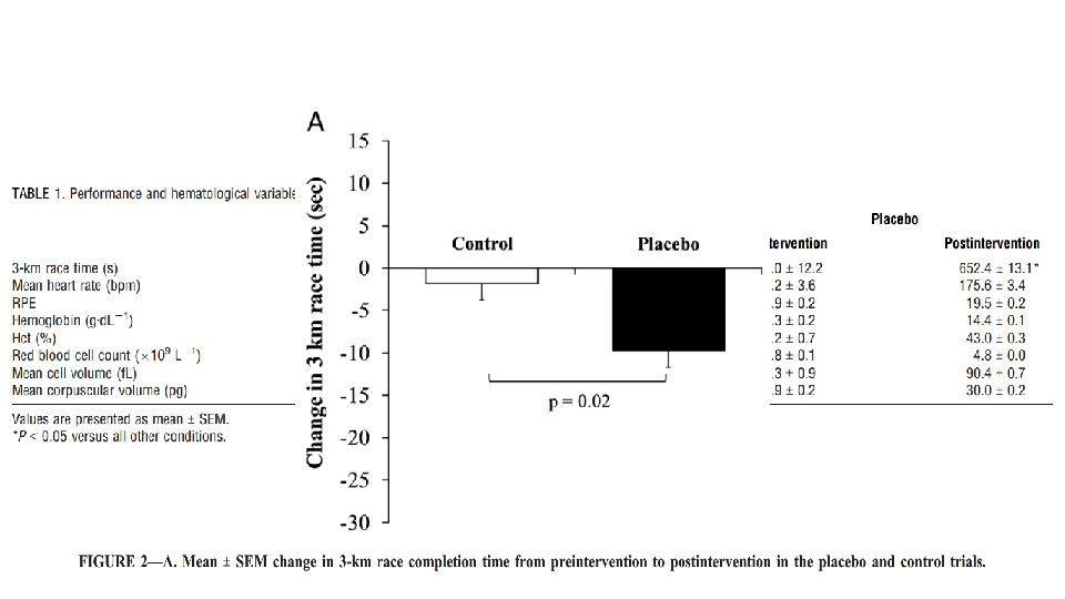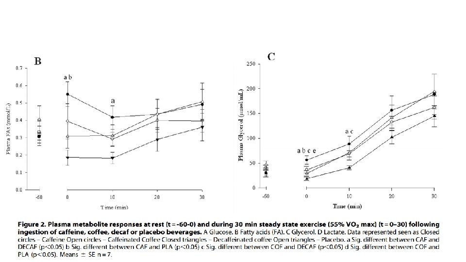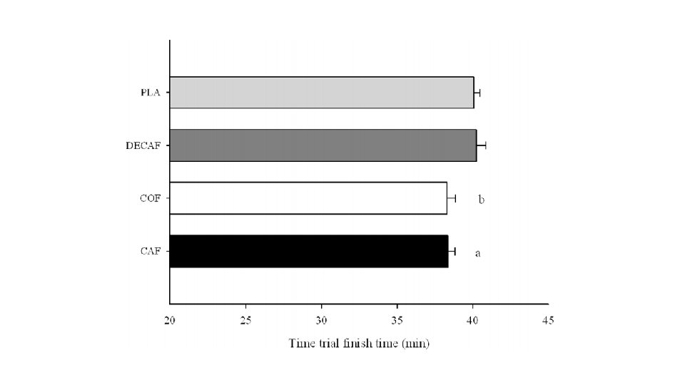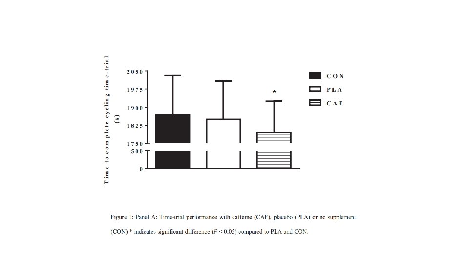 • 40 atletas de endurance (≈ 50 m. L/Kg/min) • Baixa ingestão de cafeína (≈ 60 mg/dia) • Moderada ingestão de cafeína (≈ 140 mg/dia) • Alta ingestão de cafeína (≈ 350 mg/dia) • Exercício time trial (ciclismo – 420 k. J no menor tempo possível) • Cafeína (6 mg/Kg) • Placebo • Sem suplemento