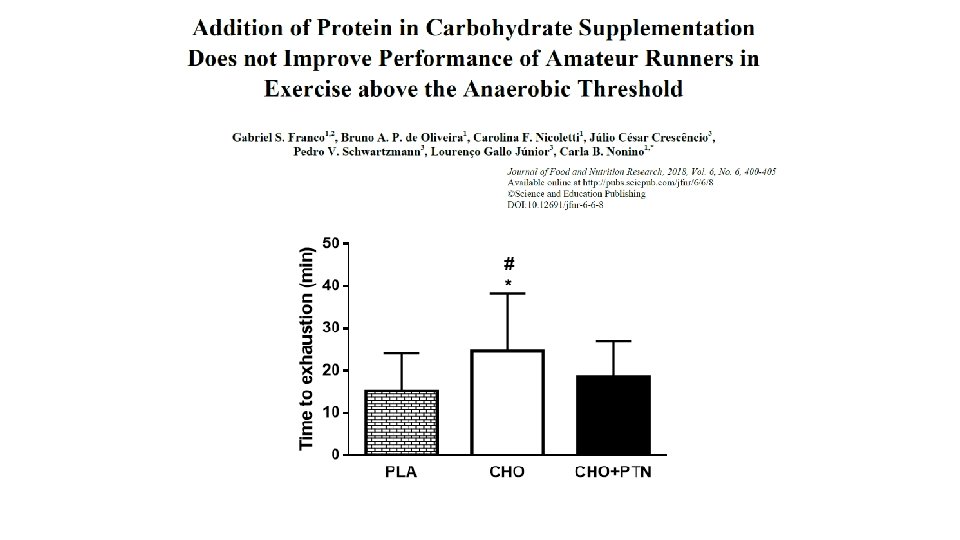 Suplementação de carboidrato adicionado de proteína • Adição de 1 g de proteína para cada 3 -4 g de CHO • • Redução na oxidação de CHO Aumento no tempo de exaustão de atletas Maior reidratação tecidual Diminuição na produção de cortisol (IVY et al. , 2003; SAUNDERS; LUDEN; HERRICK, 2007; MCLELLAN; PASIAKOS; LIBERMAN, 2014) • Ausência de um consenso científico • Duração do exercício • Intensidade do exercício (VAN ESSEN & GIBALA, 2006; COLETTA; THOMPSON; RAYNOR, 2013)