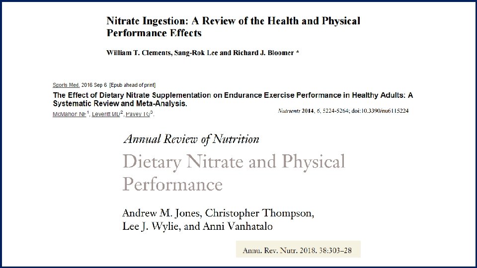 • Suco de beterraba (500 ml – 5 mmol NO 3 -) • Recomendação: 5 a 9 mmol NO 3 - (≈ 300 a 600 mg de NO 3 -) (KREUTZ et al. , 2012) (200 mg de NO 3 - /100 g de beterraba crua) • Nitrato de sódio (cuidado com rins) • Recomendação: 0, 1 mmol Na. NO 3 -/Kg (≈ 8, 5 mg/Kg) • Suplemento (Ex. Nitrato de potássio) • Efeito agudo (2 a 3 horas antes do exercício) ou crônico (3 a 15 dias) • Exercícios máximos de 5 a 25 minutos • Faltam evidências com atletas de elite