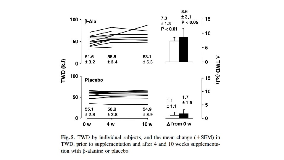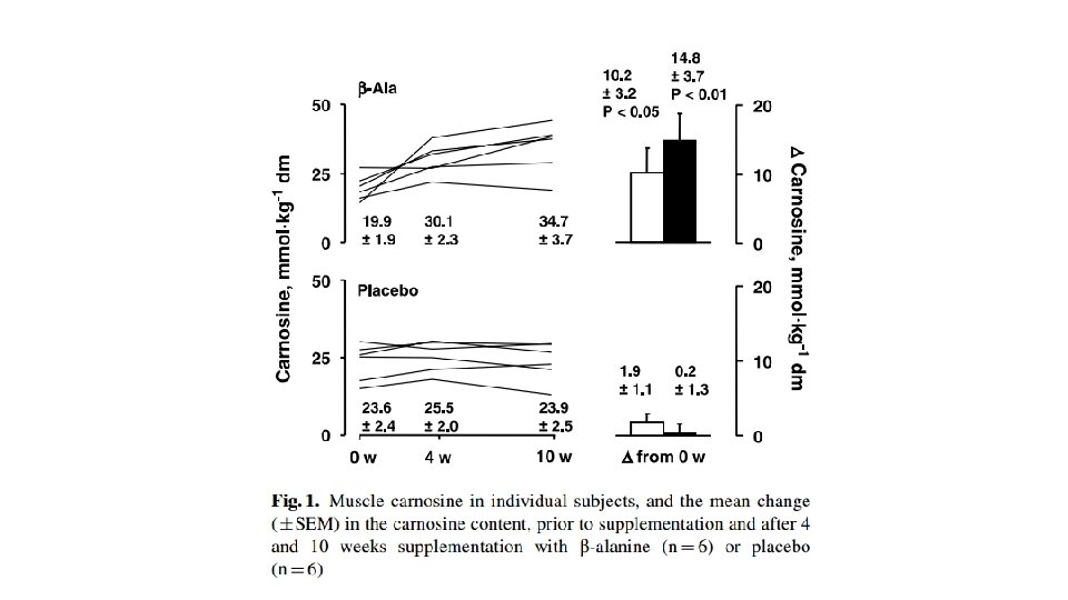 2007 • 25 indivíduos • β – Alanina (n = 13) (8 doses de 800 mg) • 4 semanas (n = 5) • 10 semanas (n = 8) • Placebo (n = 12) • Biópsia Muscular • CCT 110%