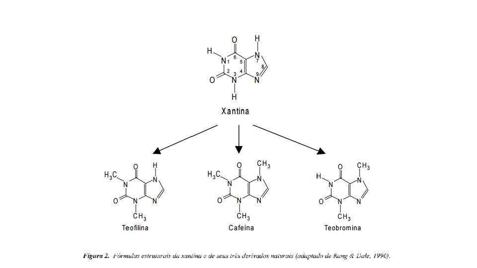 Cafeína • Alcalóide • Metabolizada no fígado e absorvida no trato gastrointestinal • Tempo de Absorção • 30 a 45 minutos • Meia vida • 3 a 7 horas • Droga mais consumida pelos adultos