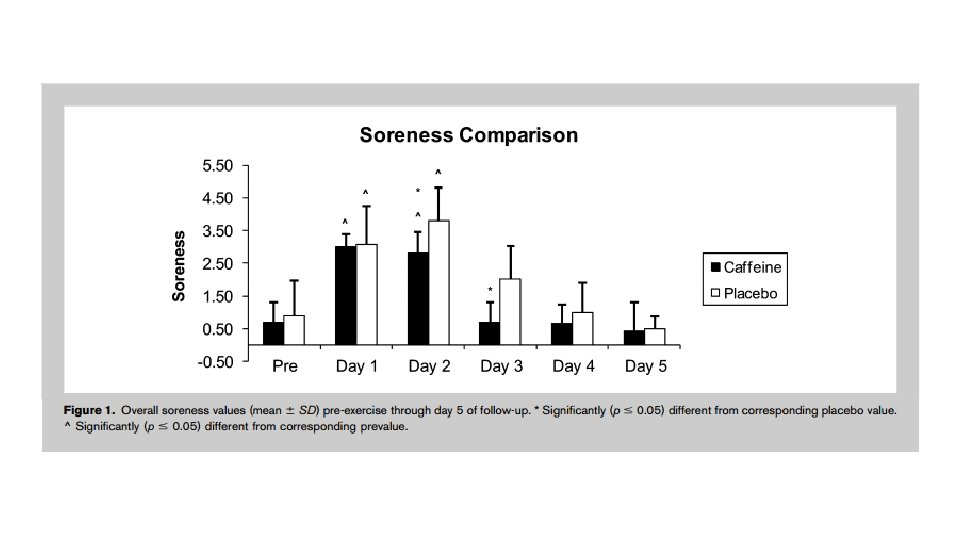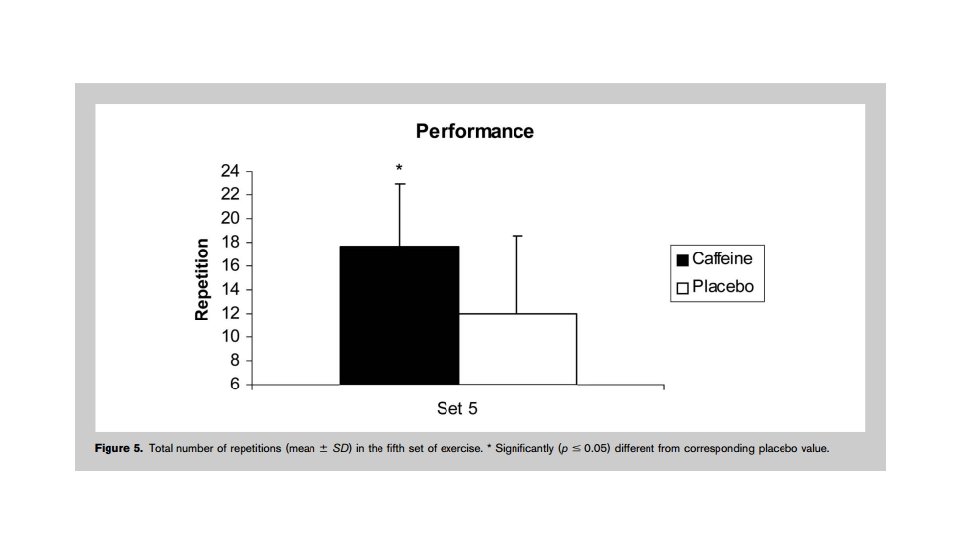 2013 • 9 indivíduos não consumidores de cafeína • Cafeína (5 mg/Kg) ou Placebo 1 hora antes e nos 5 dias posteriores ao teste • 4 séries de 10 repetições (flexão cotovelos) • 5ª série – máximo de repetições • Washout (2 dias) • Crossover