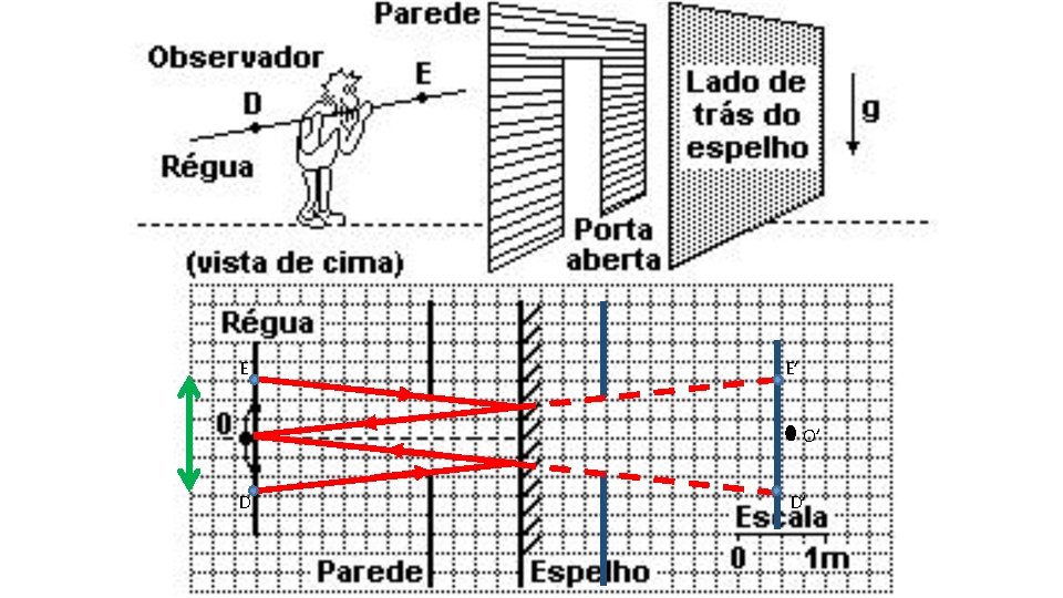 pp 224 #13 (FUVEST 2000) Um observador O olhase em um espelho plano vertical, pela abertura de uma porta, com 1 m de largura, paralela ao espelho, conforme a figura e o esquema a seguir. Segurando uma régua longa, ele a mantém na posição horizontal, e paralela ao espelho e na altura dos ombros, para avaliar os limites da região que consegue enxergar através do espelho (limite D, à sua direita, e limite E, à sua esquerda). a) No esquema adiante trace os raios que, partindo dos limites D e E da região visível da régua, atingem os olhos do observador O. Construa a solução, utilizando linhas cheias para indicar esses raios e linhas tracejadas para prolongamentos de raios ou outras linhas auxiliares. Indique, com uma flecha, o sentido de percurso da luz. b) Identifique D e E no esquema, estimando, em metros, a distância L entre esses dois pontos da régua.