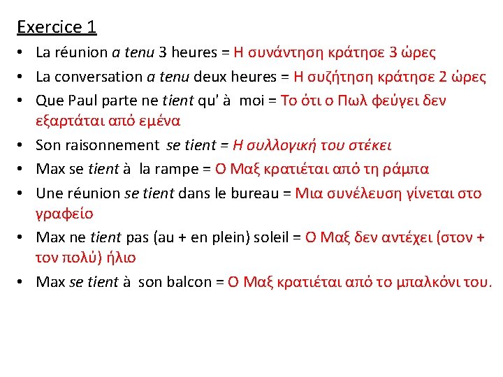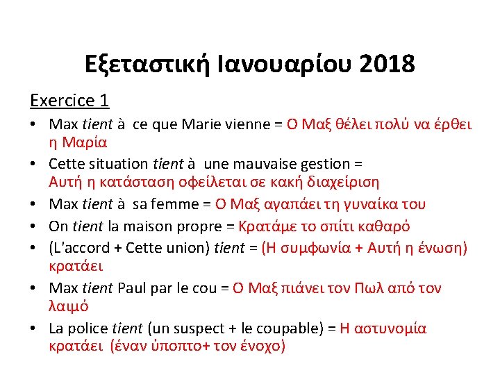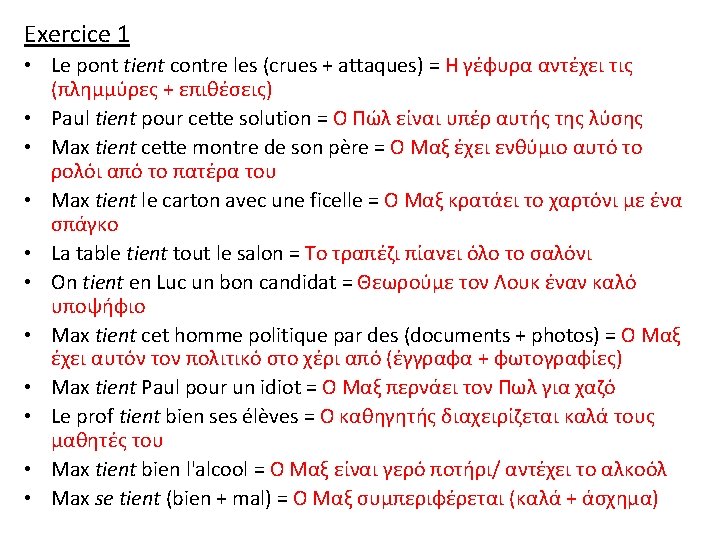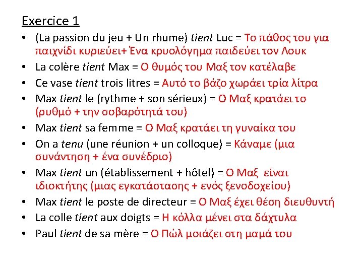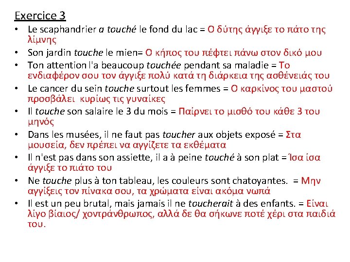 Exercice 2 SYNTAXIQUE LEXICALE SEMANTIQUE EQUIVALENCE SN + V Ça y est, j’ai saisi ! Comprendre ; capter (fam) Εντάξει, το κατάλαβα! V + SN Le tigre saisit sa proie Attraper Ο τίγρης άρπαξε το θήραμά του V + SN Saisir une opportunité Profiter de Αρπάζω μια ευκαιρία V + SN Une grande émotion S’emparer de saisit mon frère Μια μεγάλη συγκίνηση κατέλαβε τον αδερφό μου V + SN Cette similitude me saisit Αυτή η ομοιότητα με κατέπληξε Surprendre