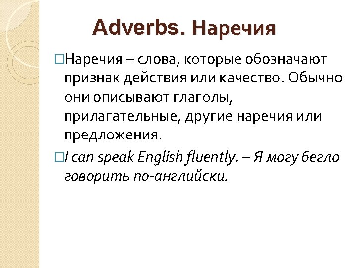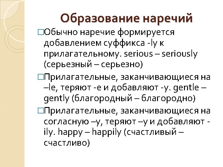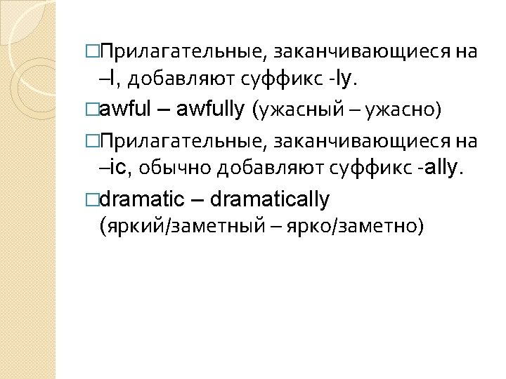 Exercise 1 �Образуйте наречия от следующих прилагательных и существительных. �Sweet, careful, real, slow, usual, calm, stupid, heroic, firm, loud, happy, safe, dry, gradual, soft, brave, hour.