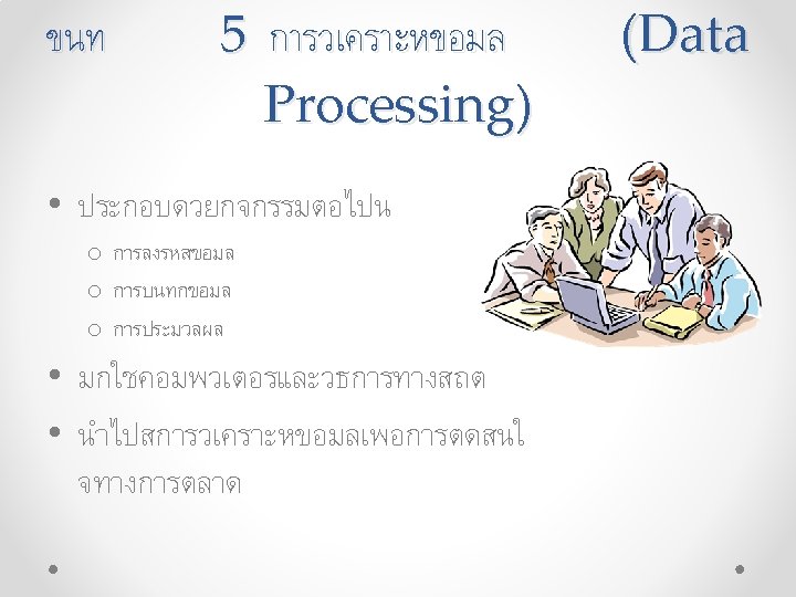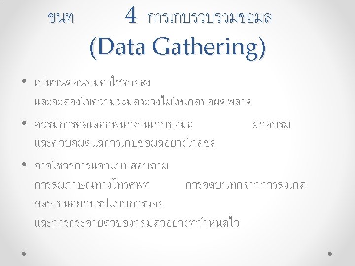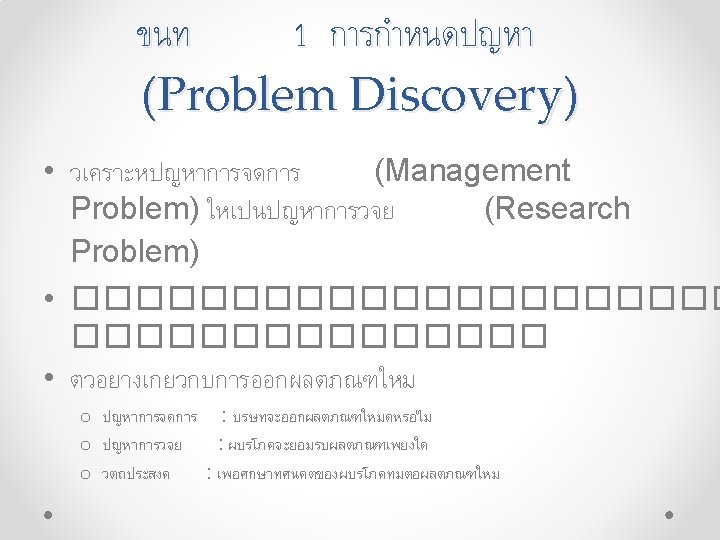 (Research Design): ระบแหลงขอมล Primary Data Secondary Data • Qualitative - Focus group - Depth interview - Projective Technique • Internal - Ready to use - To be processed • Quantitative - Survey - Observation - Experiment • External - Published - Syndicated - Databases