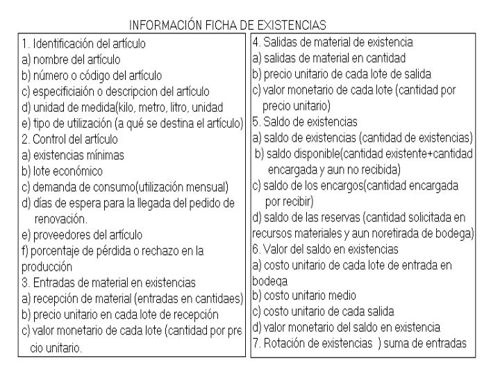 CONTROL DE EXISTENCIAS Uno de los desafíos de la administración de materiales reside en calcular y controlar las existencias para mantener en niveles adecuados o reducirlas sin afectar el proceso productivo y sin aumentar los costos financieros. Para conocer y controlar las existencias se necesitan dos herramientas administrativas básicas : a) El fichero de existencias: de nominado banco de datos sobre materiales, es un conjunto de documentos e informaciones que sirven para informar, analizar y controlar existencias. Cuando el fichero ocupa un archivo normal, su procesamiento es manual. El fichero debe contener la siguiente información.