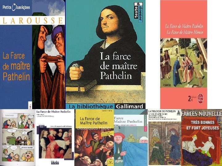 La Farce du maître Pathelin • • • vers 1460 anonyme parfois attribuée à Guillaume d’Alecis, , voire à François Villon • La pièce constitue le meilleur et l’un des plus anciens chefs-d’œuvre du théâtre comique médiéval ; • elle est, en outre, souvent considérée comme la première pièce comique de la litt. fr.
