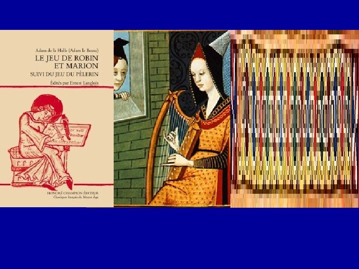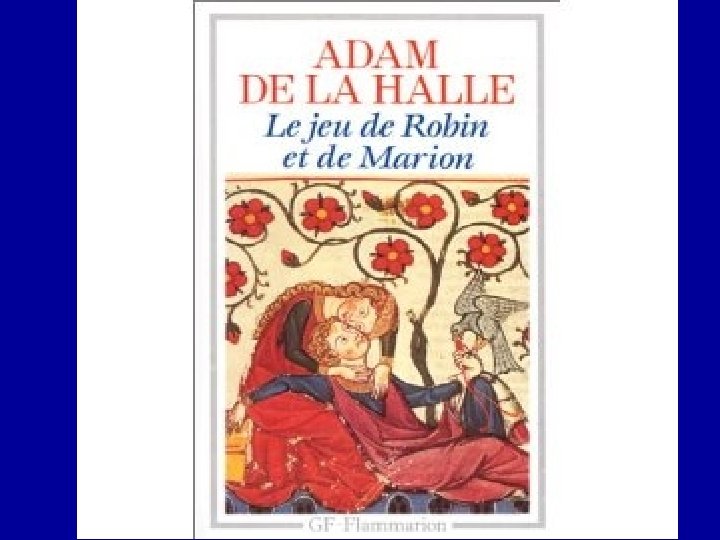 Jeu de Robin et Marion • Pastorale avec 10 personnes Robin, Marion, chevalier, six bergers et une bergère • la première comédie villageoise ou opéra-comique connue. • L'histoire des amours de Robin et de Marion a fait le fond d'un grand nombre de récits et de chansons du Moyen âge