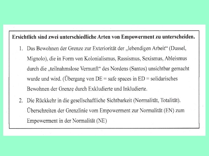 Die Idee der Bildung Unser Denken bedarf einer Verbindung von Wort und Seele, eine immer erneute Befruchtung durch Andere in Form von Affekten (Suely Rolnik). Die Verletzbarkeit muss als zentrales Merkmal der „conditio humana“ anerkannt werden (Judith Butler) Bildung muss das gemeinsame Bewohnen der Grenze als Prozess der Dekolonisierung in den Mittelpunkt stellen. Sie „zielt auf Gegengesellschaft, um über sie ein neues Land zu finden. “ (Heydorn) „Bildung ohne Herzensbildung ist auf einer Stufe mit Wissen ohne Gewissen. “ (Max Roden)