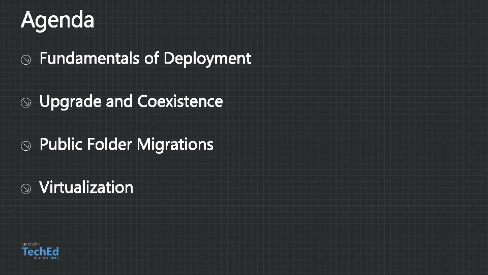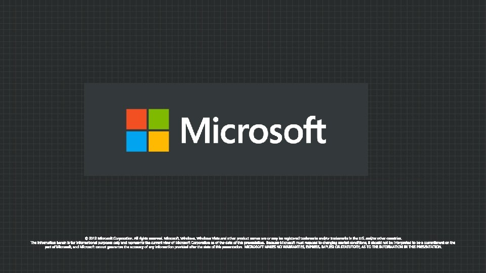 l l Disclaimer This presentation contains preliminary information that may be changed substantially prior to final commercial release of the software described herein. The information contained in this presentation represents the current view of Microsoft Corporation on the issues discussed as of the date of the presentation. Because Microsoft must respond to changing market conditions, it should not be interpreted to be a commitment on the part of Microsoft, and Microsoft cannot guarantee the accuracy of any information presented after the date of the presentation. This presentation is for informational purposes only. MICROSOFT MAKES NO WARRANTIES, EXPRESSED, IMPLIED, OR STATUTORY, AS TO THE INFORMATION IN THIS PRESENTATION. Microsoft may have patents, patent applications, trademarks, copyrights, or other intellectual property rights covering subject matter in this presentation. Except as expressly provided in any written license agreement from Microsoft, the furnishing of this information does not give you any license to these patents, trademarks, copyrights, or other intellectual property.