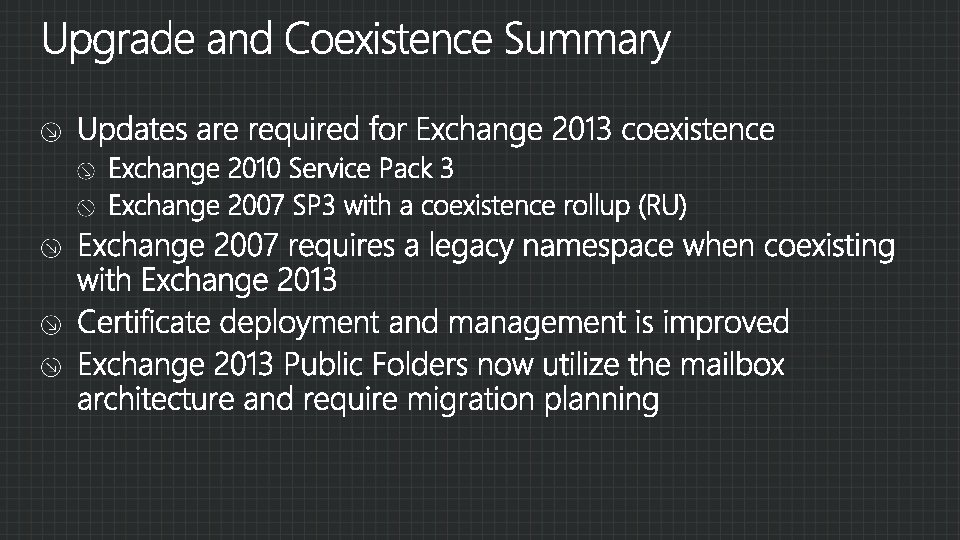 1. Prepare Clients Install Exchange SP and/or updates across the ORG autodiscover. contoso. com mail. contoso. com 3 legacy. contoso. com Prepare AD with E 2013 schema and validate 2. Deploy Exchange 2013 servers Install both E 2013 MBX and CAS servers 3. Create Legacy namespace E 2010 or 2007 HUB E 2010 or 2007 CAS E 2013 CAS Exchange 2010 or 2007 Servers SP/RU Intranet site 4. Obtain and Deploy Certificates 5. Switch primary namespace to Exchange 2013 CAS 6. Move Mailboxes 7. Repeat for additional sites E 2010 or 2007 MBX E 2013 MBX Internet facing site – Upgrade first
