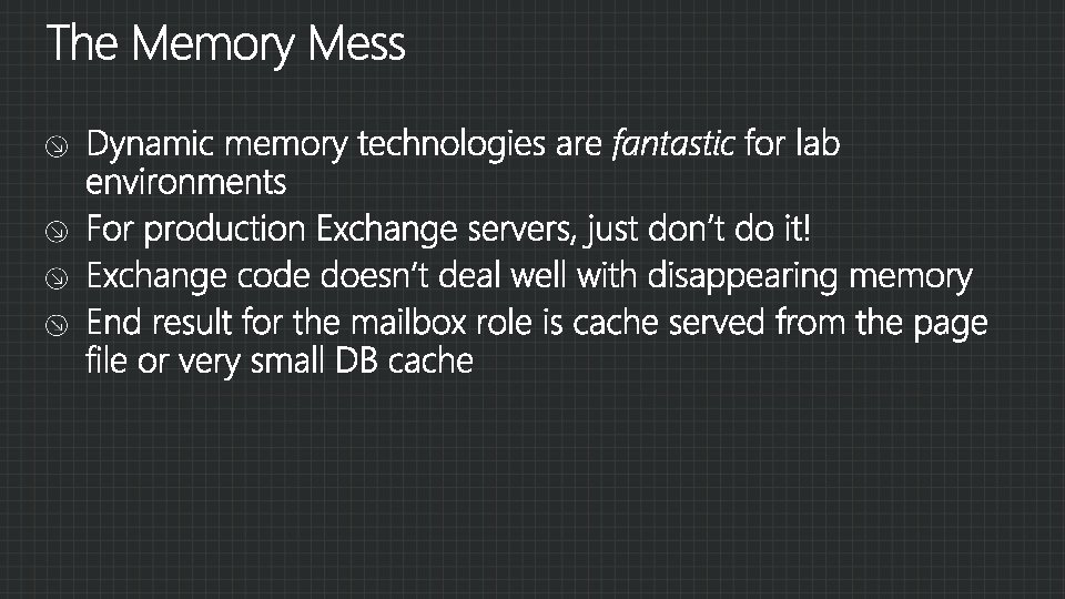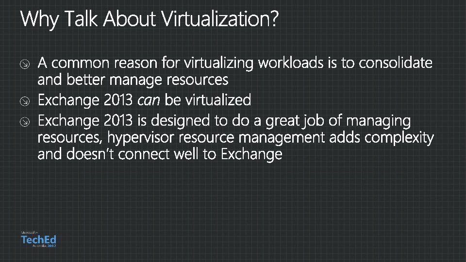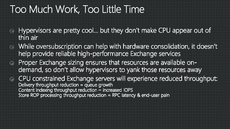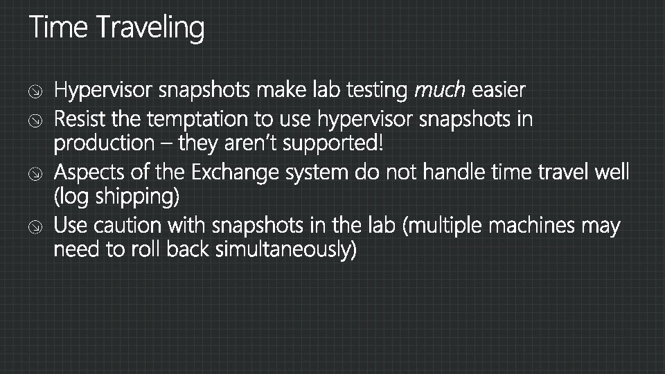 Hypervisors Host-based clustering Migration Jetstress in guests Exchange roles Storage