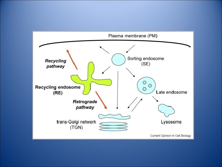 Endoszóma Korai (early) endoszóma: marginális citoplazmában. p. H: 6. 5 -5: a ligandok többsége disszociál a receptoráról (ligand-receptor uncoupling). Fontos organellum a szortirozásban - a plazmamembrán felé: reciklizáló (recycling) endoszóma - a Golgi-apparatus és lizoszóma felé: késői (late) endoszóma Multivezikuláris testek: a korai endoszómák membránja a lumen felé bimbózik sok belső vezikula képződik endoszóma membrán komponensei degradálódnak. Késői (late) endoszóma: mélyebben a citoplazmában, p. H savas. Lizoszómális enzimek akkumulálódnak bennük (vezikuláris transport a trans-Golgi hálózat felöl.