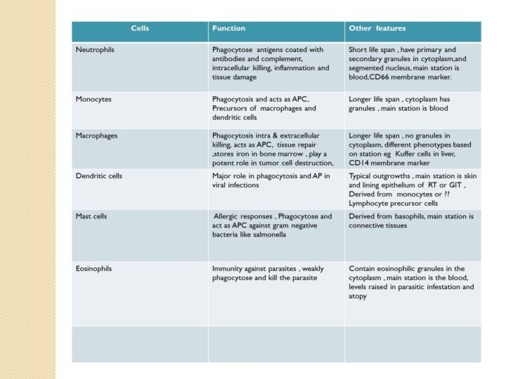 Cells involved - Professional phagocytes- have specific receptors 1. Neutrophils 2. Monocytes 3. Macrophages 4. Dendritic cells 5. Mast cells 6. Eosinophils