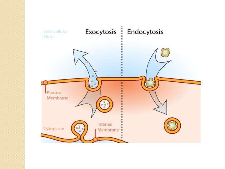 � In exocytosis, membrane – bound secretory vesicles are carried to the cell membrane, and their contents are secreted into the extracellular environment. � The secretion is possible because the vesicle transiently fuses with the outer cell membrane. � Exocytosis is also a mechanism by which cells are able to insert membrane proteins (such as ion channels and cell surface receptors), lipids, and other components into the cell membrane.