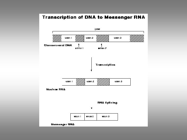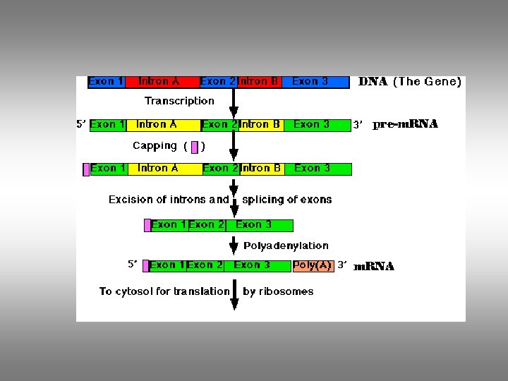 Steps in Production Proteins • exons: the sequences in the DNA molecule that code for the amino acid sequences of corresponding proteins. • intron: the DNA sequence in a eukaryotic gene that is not translated into a protein. • Transcription – DNA – pre. RNA - m. RNA • Translation – m. RNA - Proteins