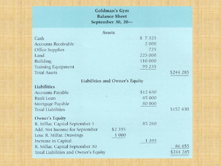 Expanded Owner’s Equity Section • The Income Statement is completed first because net income/loss affects ending Owner’s Equity on the Balance Sheet • Expanded Owner’s Equity C. Piccolo, Capital October 1 Add: Net Income for October Less: C. Piccolo, Drawings Decrease in Capital C. Piccolo, Capital October 31 $20, 000 $2, 000 3, 500 1, 500 $18, 500
