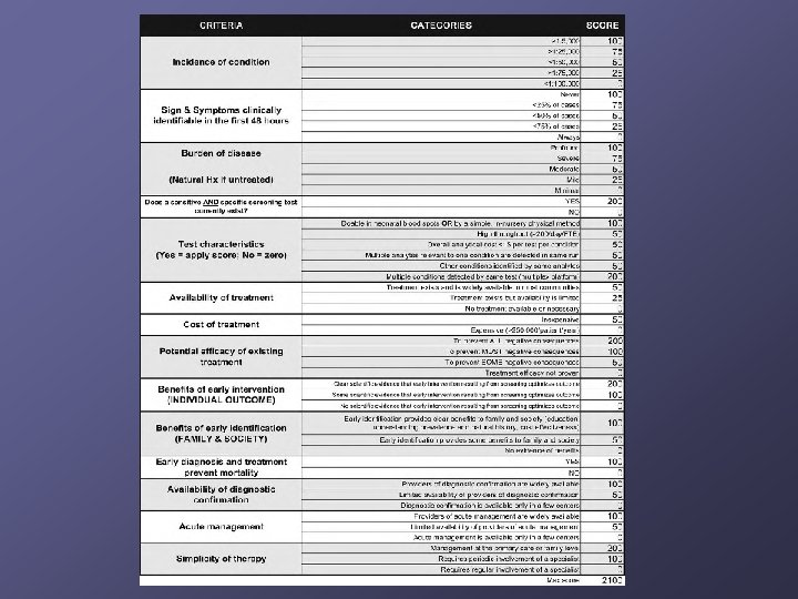 Criteria for Newborn Screening Important condition Acceptable treatment available Facilities for diagnosis and treatment Difficult to recognize early Suitable screening test Natural history known Cost-effective to diagnose and treat Wilson & Jungner, 1968