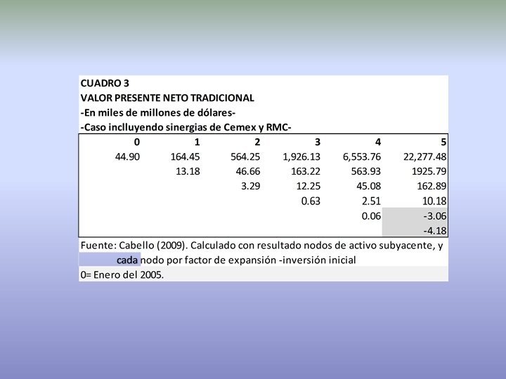 CUADRO 2 DECISIÓN DE EJERCICIO DE LA OPCIÓN DE EXPANDER O ADQUIRIR RMC -En miles de millones de dólares- -Caso incluyendo sinergias de Cemex y RMC 0 1 2 3 4 5 continuar continuar expander $47. 63 continuar continuar expander continuar expander continuar fin: 0. 21 fin: 0. 02 Fuente: Cabello (2009). Calculado con método binomial, y opciones reales. 0= Enero del 2005.