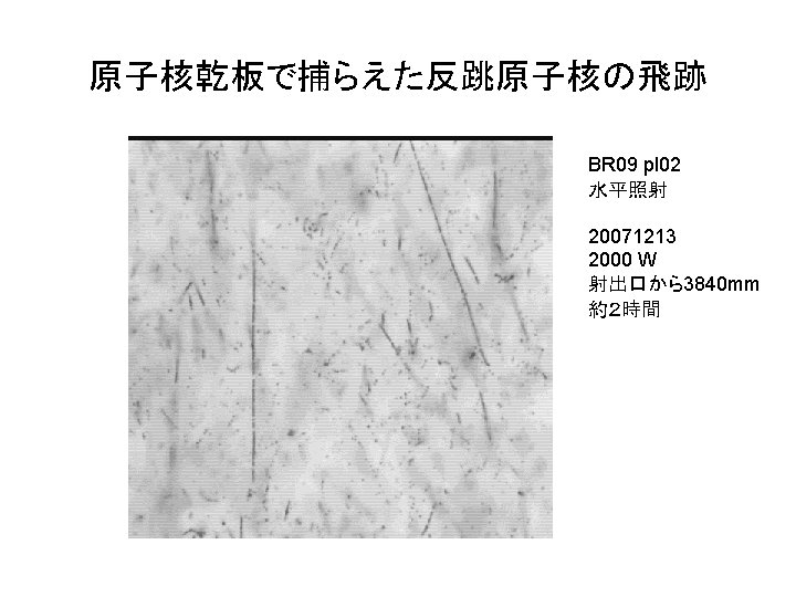 Tracks of Recoil Proton in OPERA Film Date: 20071213 reactor power: 2000 W Distance form column: 3840 mm hour:~2 BR 04 pl 02 perpendicular BR 09 pl 02 horizontal (Details see poster “Test of neutron monitoring” by Mr. Morishima)