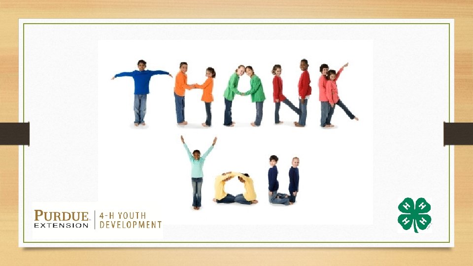 Let’s Share the Results • What questions do you feel would be helpful to get the information you need to evaluate the 4 -H’er’s project? • • What questions would help the 4 -H’er process what they did? What questions would help the 4 -H’er link life skills to the project? What questions would help the 4 -H’er link knowledge to the future? Any other questions that would help a judge or the 4 -H’er?