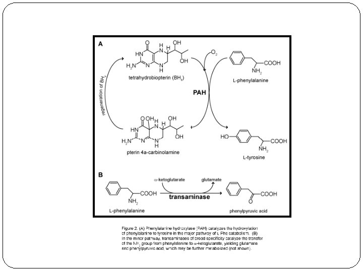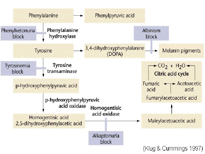 Phenylketonuria Inherited disorder (autosomal recessive) of phenylalanine metabolism causing severe mental retardation Diagnosed by finding excess phenylpyruvic acid in serum and urine Lack of enzyme phenylalanine hydroxylase causes accumulation of phenylalanine in plasma Urine: “Mousy odor” Physical: Eczema Fair coloring as a result of tyrosine deficiency(pigmentation metabolite, melanin) Enzyme: Phenylalanine Hydroxylase the enzyme locus is on chromosome arm 12 q