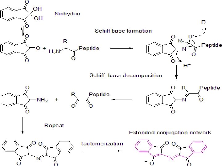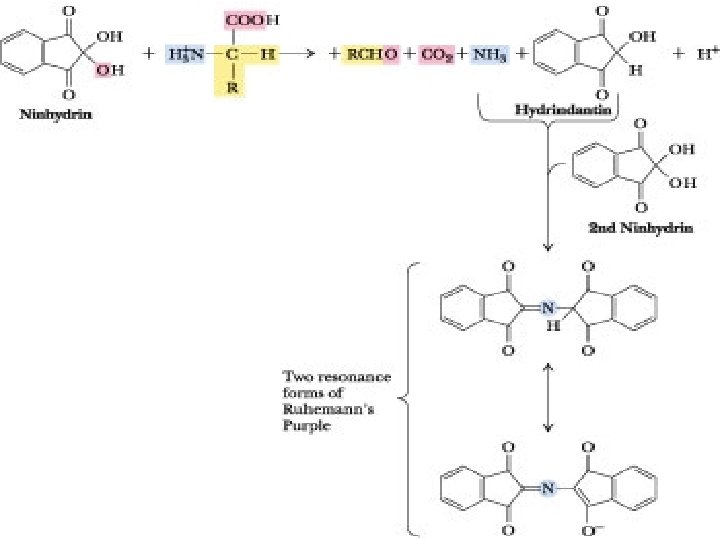 Reactions alpha-amino acid + ninhydrin reduced ninhydrin + alpha-amino acid + H 2 O alpha-keto acid +NH 3 alpha-keto acid + NH 3 aldehyde + CO 2