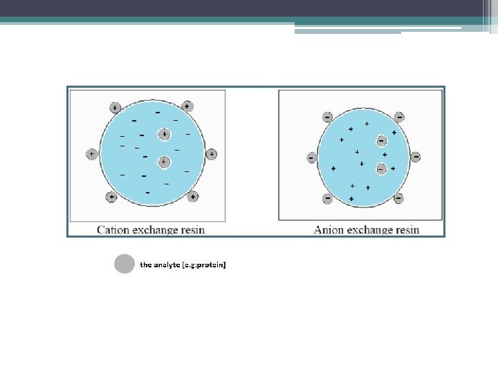 -Cation exchange chromatography: retains positively charged cations because the stationary phase displays a negatively charged functional group. [R-X ] -Anion exchange chromatography: retains negatively charged ions because the stationary phase displays positively charged functional group. [R-X+ ] Remember: -The mobile phase: (buffered aqueous solution). -Stationary phase material is a resin or gel matrix beads with covalently bonded charged functional groups. [differ from gel filtration chromatography].