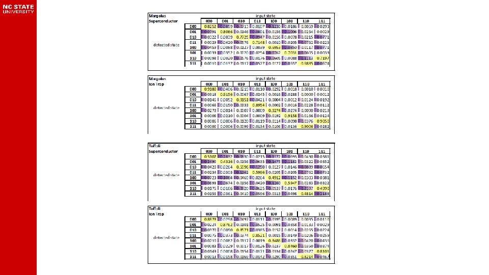 Experimental Results Connectivity Hardware Star shaped Fully connected Superconducting Ion trap Success Obs probability/% Rand Sys Obs Rand Sys Margolus 74. 1 82 75 90. 1 91 81 Toffoli 52. 6 78 59 85. 0 89 78 Bernstein– Vazirani 72. 8 80 74 85. 1 90 77 Hidden shift 35. 1 75 52 77. 1 86 57