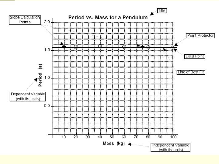 Summary--Characteristics of Good Graphs 1. It is plotted on a grid (graph paper) 2. The axes are highlighted (darker than the rest of the grid lines) and are drawn with a ruler. 3. Both axes are labeled with the variable name and its units. Note that we do not label them x or y! 4. The independent variable is plotted on the horizontal (x) axis (generally). 5. The dependent variable is plotted on the vertical (y) axis (generally). 6. The data points have point protectors 7. A line of best fit is drawn which shows the trend of the data. The line of best fit may have some points above it, some below it, and some on it. If the trend of the data is linear, the line of best fit is drawn with a ruler. If the trend of the data is curved, a smooth curve should be drawn. 8. The graph is clearly titled using the convention dependent variable vs. independent variable. 9. The axes are properly scaled so that the graph fits the space, the grids are consistently scaled, and all of the data fits on the graph. 10. The slope calculation points are clearly marked with a (+) on the line of best fit.