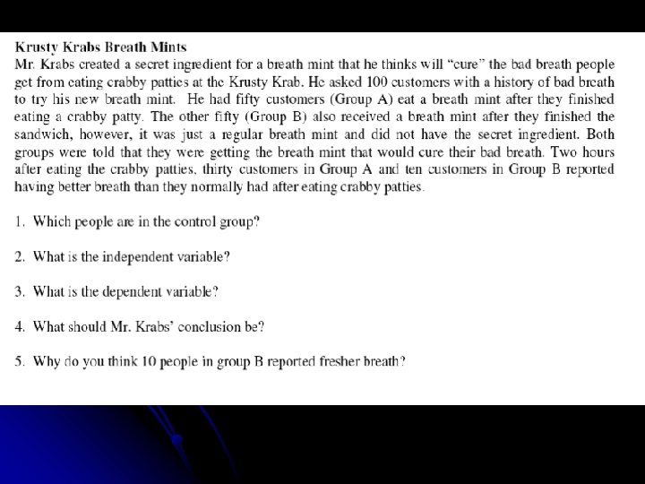 Control l The group that has no variable acting upon it so that it can be compared with the results of the experiment l In drug tests, this group is given sugar pills (placebos) instead of the medicine. They are told it is medicine.