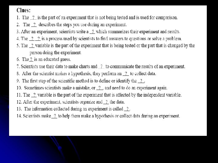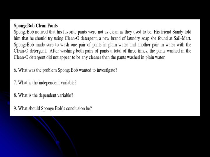 When Experiments are Testing for something they have …. . l Independent variable (I. V. )- the factor (or variable) that gets changed on purpose in an experiment while all others remain constant. l I. V. – I changed it myself