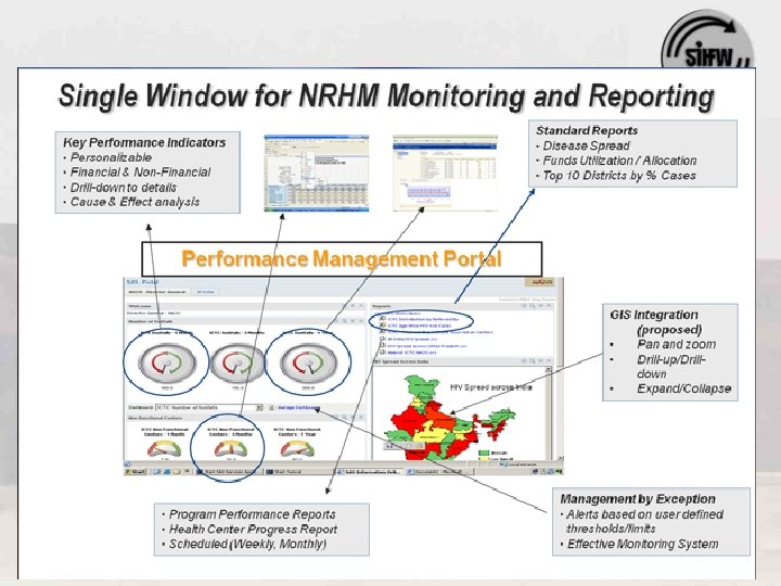 PHC Online monitoring • New initiatives- Infrastructure report of the PHC’s now collected through OMR sheets will also be converted to online reporting • Family Welfare and RCH reports now collected through email are being converted to online reporting directly from the PHC’s. • Financial reporting for NRHM/RCH to be integrated into the online reporting • Data to be entered at the PHC level using PHC staff. VHNs to make the data available during weekly meetings • Other alternatives such as simputers for the VHN’s, smart card systems for pregnancy and child tracking to be explored on pilot basis.