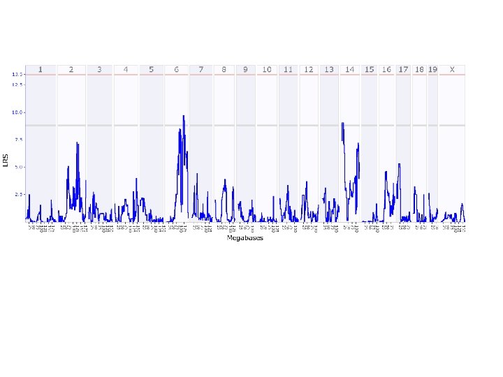QTL is good for detecting the approximate locus of multiple genes affecting a phenotype across all the chromosomes, except Y. This is a graph that displays the likelihood ratio statistic as a function of locus on the various chromosomes, which are numbered at top.