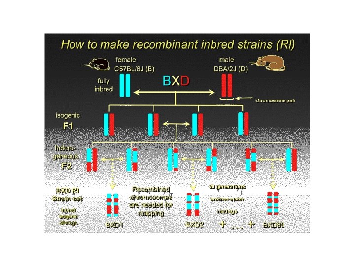And now: how to make a recombinant inbred strain of mouse. Start with two already inbred mouse strains (so that they are homozygous in their alleles), that are quite discrepant (far apart) on the phenotypic trait of interest, and cross them.