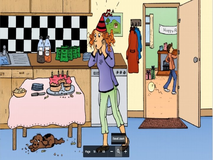 Who ate the cake? Explain- What is happening in the picture? Who can you see? What is going on? When is it happening? Where are they? How did the dog manage to eat the cake? Why is the dog hiding? It’s someone’s birthday. How do you know? What happens when it is time to eat the cake? What do you do when it’s your birthday? Predict-The cake is ruined. How does mum feel? How will the boy whose birthday it is feel? The dog has eaten a lot of cake. Dogs are not suppose to eat cake. What may happen? What may mum say to the dog when she has seen the cake has been eaten? The cake is ruined. What could Mum do? Imagine- Think of some similes : The dog was as hungry as … (e. g. a starving lion etc. ) Imagine the dog could talk. What would he say? Now imagine the best birthday ever. Who would be there? What would the cake be like? Where would the birthday party be held?