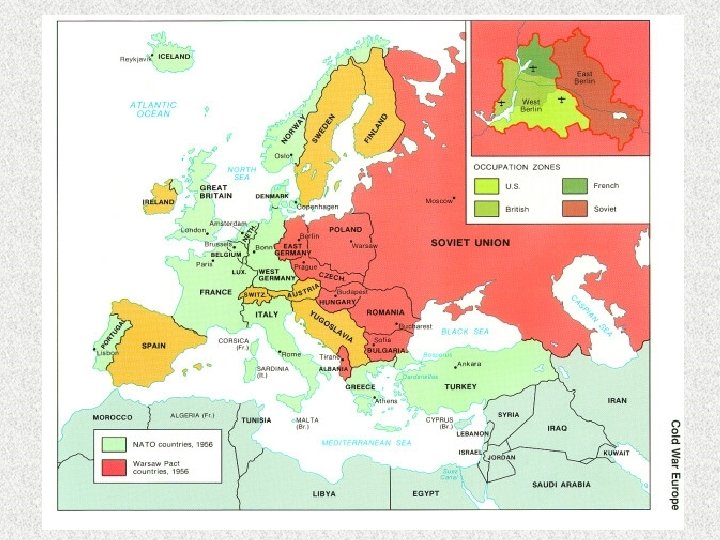 Causes of the Cold War: 3 views • Traditionalist -- Evil Soviets caused it and were bent on world domination. – Communist expansion in Eastern Europe and Asia seemed to support this view. • Revisionist -- USA caused it by over-reacting to reasonable USSR security measures. USA and USSR misperceived each other’s intentions, but US reaction more provocative. – USA and other states had tried to undermine Soviets during Russian Revolution. Capitalist states wished to stomp out atheistic communists. NATO and other alliances used to “Contain” USSR.