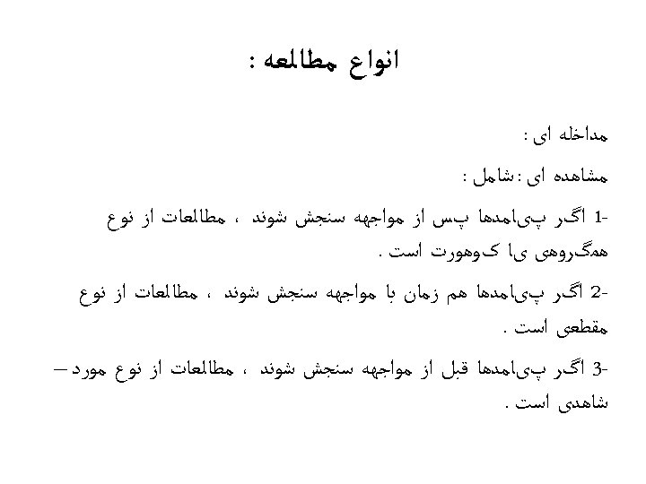 ﻃﺒﻘﻪ ﺑﻨﺪی ﺷﻮﺍﻫﺪ 2++ : - High-quality systematic reviews of case-control or cohort studies or - high- quality case-control or cohort studies with a very low risk of confounding , bias or chance and a high probability that the relationship is casual 2+ : Well-conducted case-control or cohort studies with a low risk of confounding , bias or chance and a moderate probability that the relationship is casual 2 - : Case-control or cohort studies with a high risk of confounding , bias or chance and a significant probability that the relationship is casual