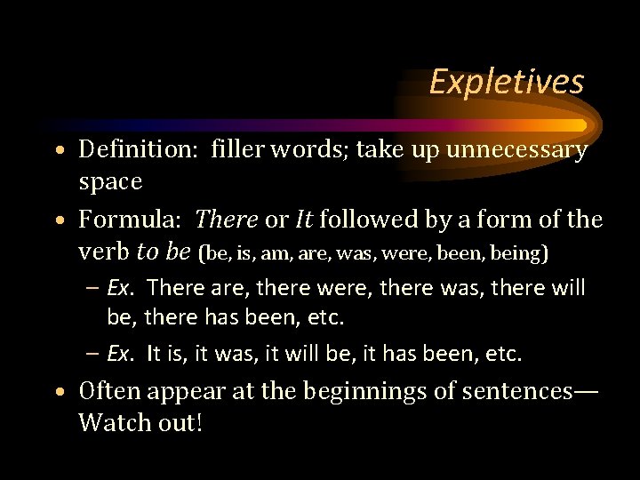 Expletives • Definition: filler words; take up unnecessary space • Formula: There or It followed by a form of the verb to be (be, is, am, are, was, were, been, being) – Ex. There are, there were, there was, there will be, there has been, etc. – Ex. It is, it was, it will be, it has been, etc. • Often appear at the beginnings of sentences— Watch out!