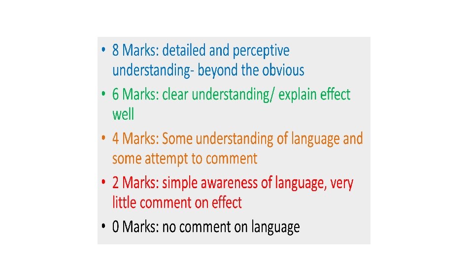 Basic Point made 1 Evidence: Quotation 2 Technique used: Simile? Metaphor? Adverbs? 3 Explanatio n Alternative explanation: give other interpretations Reflect: This links to the writer’s message that… LINK TO QUESTION 4 5 6/7 8/9 We use the above and below the water line as ‘The C Line’ – if you want a C and beyond, you have to offer deeper analysis. Remember a C no longer exists, but we are aiming for a Grade 4/5 to achieve the same level of competency.