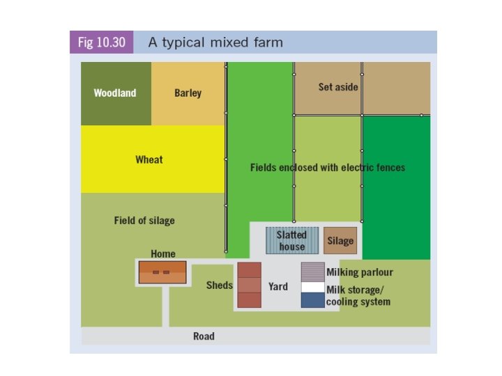 Farming • Farming is an example of a primary economic activity. There are many different types of farming which produce different types of produce. Examples include; 1. 2. 3. 4. 5. Dairy farming Cereal farming (Tillage) Market gardening Beef farming Mixed farming