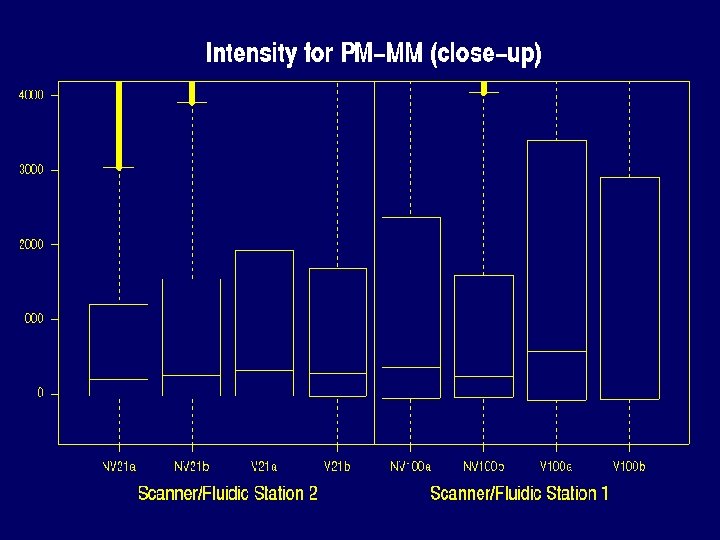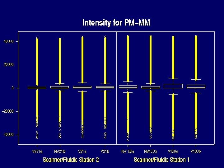 Saturation problem Probes reaching maximum in experiment 1 Scanner Chip PM MM Value 2 NV 21 a 354 25 46140 2 NV 21 b 564 57 46144 2 V 21 a 1004 83 46141 2 V 21 b 665 51 46139 1 NV 100 a 1917 328 46154 1 NV 100 b 1265 168 46160 1 V 100 a 3399 1085 46155 1 V 100 b 2267 446 46149