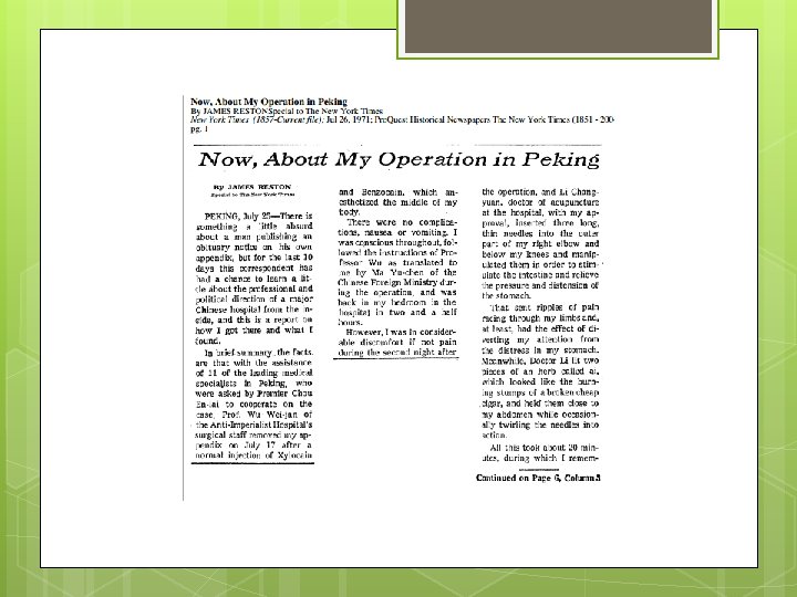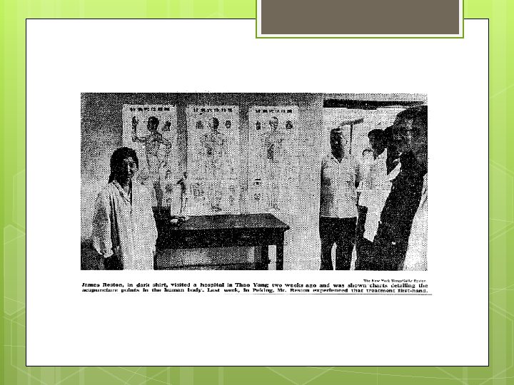 Modern Use TCM – a systemized version of the many theories of Chinese Medicine since Cultural Revolution in China The West “discovered” acupuncture July 1971 when James Reston, Press secretary for Richard Nixon fell ill and needed an emergency appendectomy.